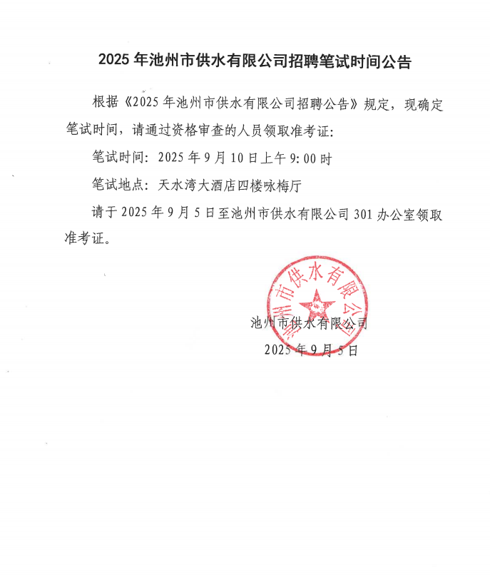 2025年池州市供水有限公司招聘筆試時(shí)間公告 | |