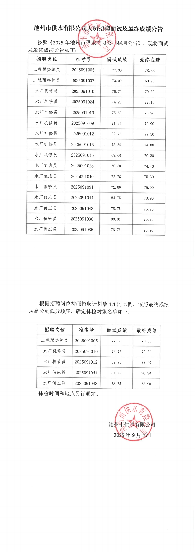 池州市供水有限公司人員招聘面試及最終成績公告 | |